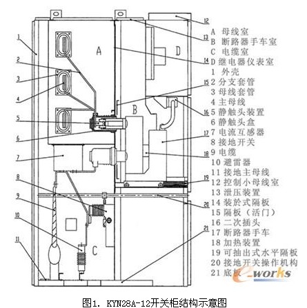 KYN28型高壓開關柜按GB3906-913-35KV交流金屬封閉開關設備》設計。整體由柜體和中置式可抽出部件(即手車)兩大部分組成,開關柜的結構示意圖見圖 1。柜體分隔為四個獨立小室(A:母線室,B:斷路器手車室,C:電纜,D:繼電器儀表室),當斷路器室門打開時具有架空進出線、電纜進出線及其它功能 方案,經排列、組合后能成為各種主結線方案的配電裝置。本開關柜可以從正面進行安裝調試和維護,即保證了安全性;又提高了靈活性,體積小,減少了占地面 積。
