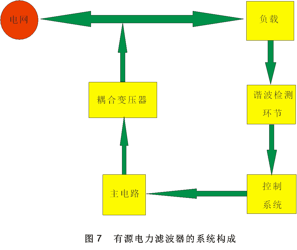 無論有源電力濾波器如何分類,它都是由幾個(gè)共同的部分構(gòu)成,即諧波檢測環(huán)節(jié)、控制系統(tǒng)、主電路以及耦合變壓器四個(gè)主要的部分構(gòu)成。如圖7所示,基本工作原理為:首先通過諧波檢測環(huán)節(jié)檢測出系統(tǒng)中的諧波并給出需要補(bǔ)償諧波的參考值,然后通過控制系統(tǒng)根