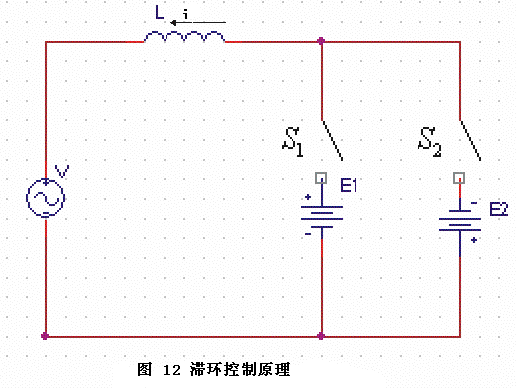 滯環(huán)比較控制的原理如圖12所示。是兩個(gè)開關(guān),E1和E2等效于直流側(cè)電壓源。對于不同的開關(guān)狀態(tài),有不同的電壓源E1和E2接入回路,從而控制電流i的變化。在具體的操作中,當(dāng)產(chǎn)生的實(shí)際補(bǔ)償電流低于參考電流時(shí),閉合,打開,加在電感L上的電壓為正,i增加;當(dāng)產(chǎn)生的實(shí)際補(bǔ)償電流高于參考電流時(shí),加在電感L上的電壓為負(fù),i減少。通過控制的開關(guān)狀態(tài)來控制注入電流的變化。