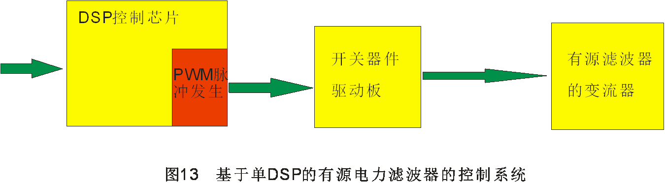 隨著微電子技術(shù)的快速發(fā)展,產(chǎn)生PWM脈沖的數(shù)字電路和具有可編程功能的器件快速發(fā)展因而通過專門電路或通過可編程邏輯器件實(shí)現(xiàn)PWM脈沖發(fā)生器已非常方便而且在速度和分辨率方面有看顯著的提高,因此有源電力濾波器的控制系統(tǒng)已經(jīng)逐步變成純數(shù)字的控制系統(tǒng)。與其他的電力電子裝置類似,根據(jù)有源濾波器控制算法的復(fù)雜性我們可以選擇不同的數(shù)字控制系統(tǒng)來實(shí)現(xiàn)。通常的控制系統(tǒng)一般有基于單數(shù)字信號(hào)處理芯片的帶有PWM信號(hào)的控制系統(tǒng),即如圖13所示的控制系統(tǒng)。由于DSP本身帶有PWM脈沖產(chǎn)生部分,因此采用單片的DSP就可以實(shí)現(xiàn)有源電力濾波器的控制系統(tǒng)。