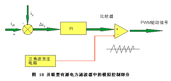 圖10給出了在并聯(lián)型有源電力濾波器中經(jīng)常采用的一種數(shù)字模擬混合控制器的模擬部分。其中參考電流信號(hào)由微處理器通過D/A轉(zhuǎn)換變成模擬信號(hào)送到模擬控制部分。有源電力濾波器的補(bǔ)償電流與參考電流進(jìn)行比較,通過比例積分環(huán)節(jié)后成為調(diào)整信號(hào),與三角波發(fā)生電路產(chǎn)生的作為載波信號(hào)的三角波進(jìn)行比較,獲得驅(qū)動(dòng)有源濾波器逆變器的PWM驅(qū)動(dòng)脈沖。