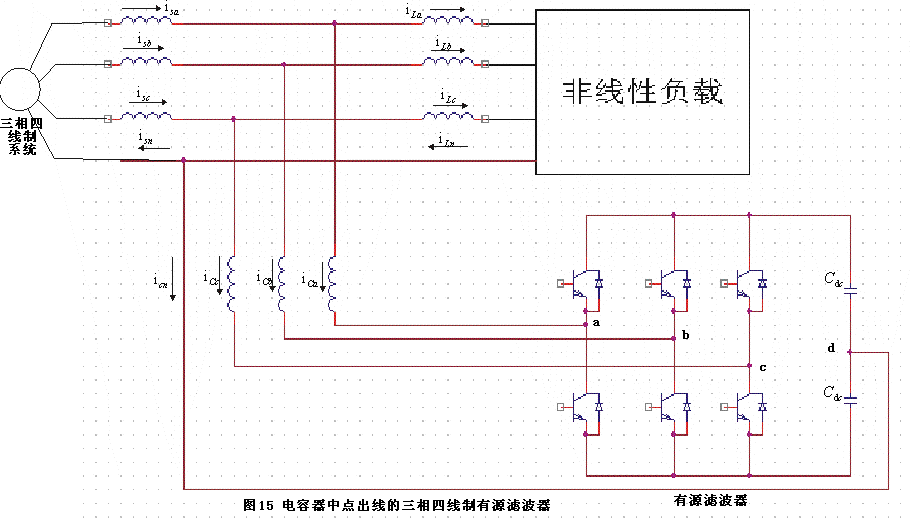 我國380V系統(tǒng)均為三相四線制系統(tǒng),而負(fù)荷通常也為三相四線制即存在中線,因而三相電流之和通常不為零即存在零序電流,零序電流中既可能存在零序基波分量也可能存在零序諧波分量,此時(shí)采用并聯(lián)型三相三線制主電路的電力濾波器無法消除線路中的零序基波電流和諧波電流以及中線中的電流。在許多情況下,為了保持三相電流的平衡,在大型辦公樓中通常會(huì)在三相中合理分配負(fù)荷,使三相電流盡量平衡。但是由于單相負(fù)荷如計(jì)算機(jī)、工作站等信息設(shè)備的大量使用,以及大量設(shè)備是后來增加的,因此實(shí)際中要合理的分配三相負(fù)荷是很難做到的。所以在許多大型的辦公樓出現(xiàn)了三相電流嚴(yán)重不平衡,中線電流很大。并聯(lián)型三相四線制有源電力濾波器就是解決這種非線性不平衡問題和諧波問題的有力手段,圖15所示為目前常見的三相四線制結(jié)構(gòu)的并聯(lián)型有源電力濾波器。直流電容中線點(diǎn)與系統(tǒng)中線相連,全部的中線電流都流經(jīng)直流側(cè)的電容器,其數(shù)值較大。同時(shí)由于中線接在電容器中間,因此有源電力濾波器運(yùn)行中還可能出現(xiàn)電容電壓不平衡問題,所以在有源濾波器控制中還應(yīng)該加入直流側(cè)電容電壓平衡控制。這種結(jié)構(gòu)主要用于小容量系統(tǒng)。