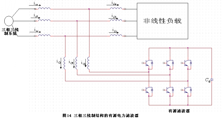 由于許多負(fù)荷本身只是三相三線制接線,因此針對此類負(fù)荷的有源電力濾波器也只需采用三相三線制主電路即可。目前大量功率開關(guān)模塊都已經(jīng)讓三相三橋臂結(jié)構(gòu)制作,因此實(shí)現(xiàn)三相三線制主電路結(jié)構(gòu)非常方便。圖14所示為三相三線制結(jié)構(gòu)的有源電力濾波器。