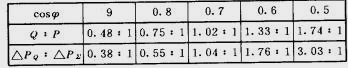 得知當(dāng)電網(wǎng)結(jié)構(gòu)固定,輸送的有功功率一定時(shí)ΔP∑的大小取決于Q的變化,即與Q的平方成正比。下面的表格表示了不同負(fù)荷功率因數(shù)下,電網(wǎng)需要輸送的Q造成ΔP∑的變化。
